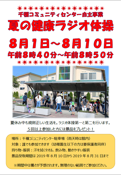 ラジオ体操第一と第二を行います。5回以上参加した方には景品をプレゼント!